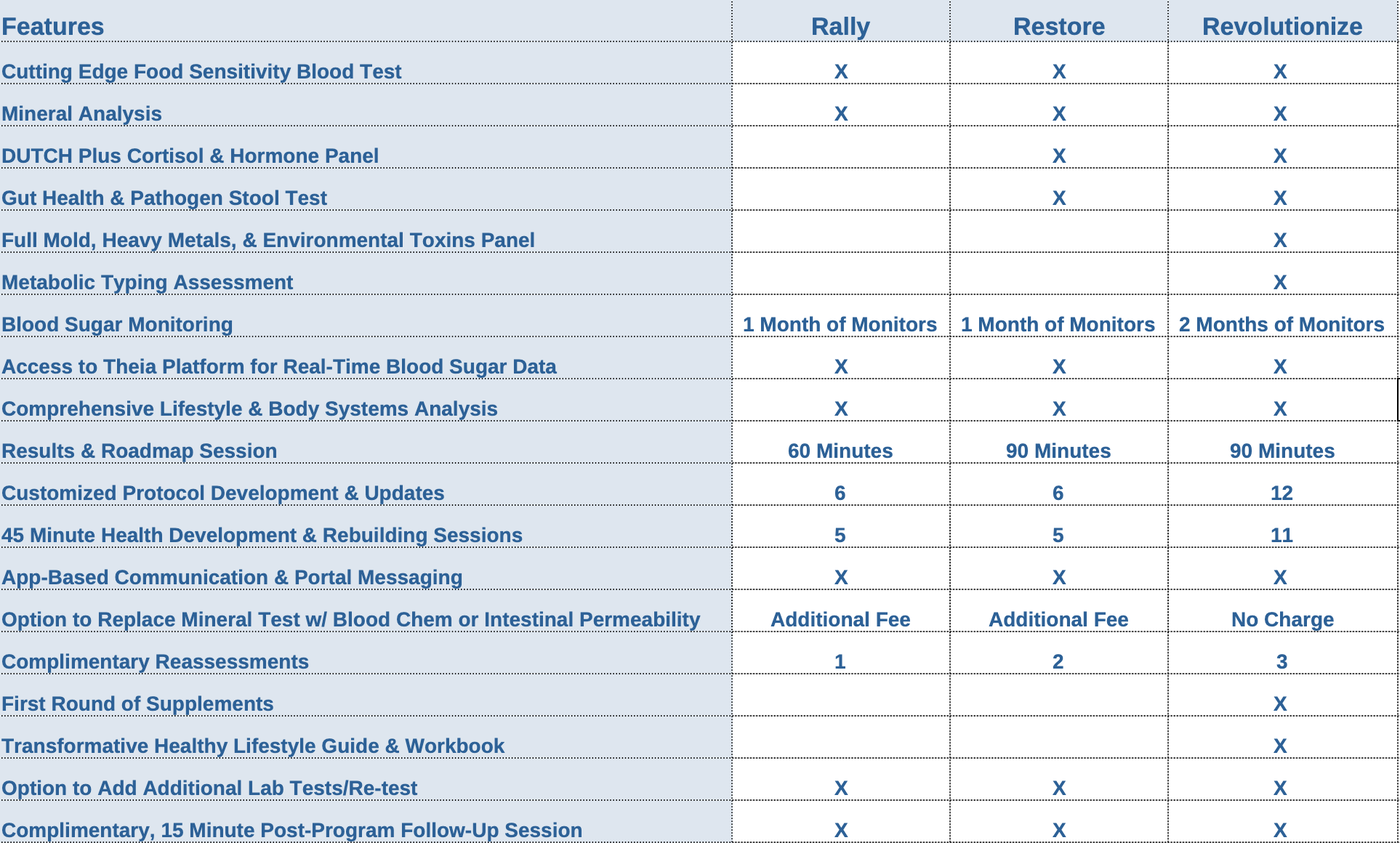 This 12 session, comprehensive program is focused on Total Transformation, building upon the state-of-the-art functional lab tests in the Restore package, and adding in a deeper layer of assessment examining toxic burden in the body as a contributor to health symptoms.